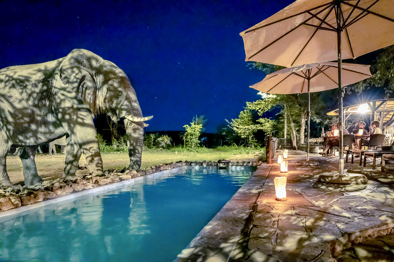 Das massive Hauptgebäude mit Turm und antiken Elementen bietet eine Kombination aus afrikanischer, marrokanischer und indischer Architektur. Es beherbergt eine grosszügige Lounge, Restaurant, Weinkeller und einen Swimmingpool plus einen Planschpool. Vom Hauptgebäude aus kann man das Geschehen am Wasserloch bestens beobachten.