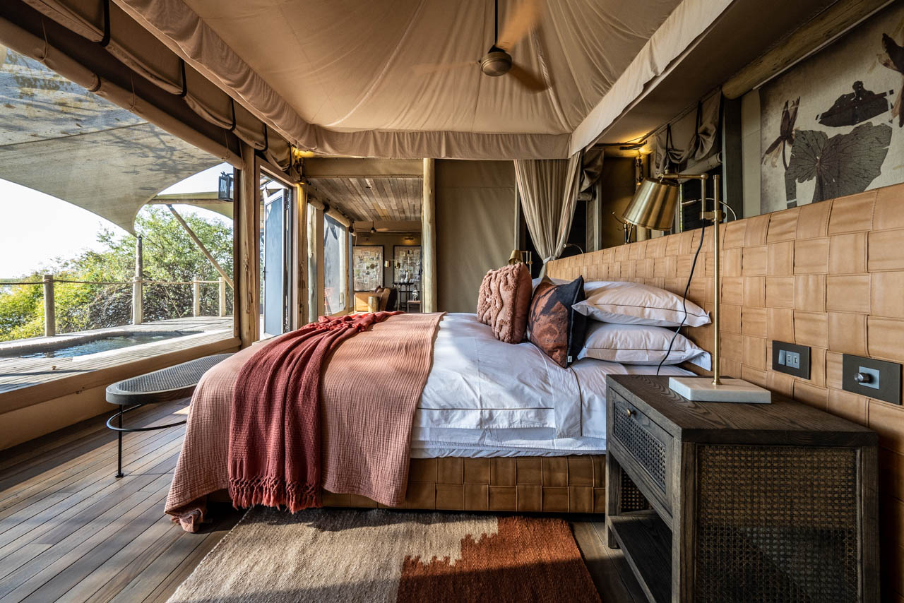 Hölzerne Stege führen zu den vier schönen Zimmern (142m²), jedes mit en-suite Badezimmer, Innen- und Aussendusche, Lounge und eigener Veranda mit Planschpool, von wo aus man die Hippos und Elefanten beobachten kann.
